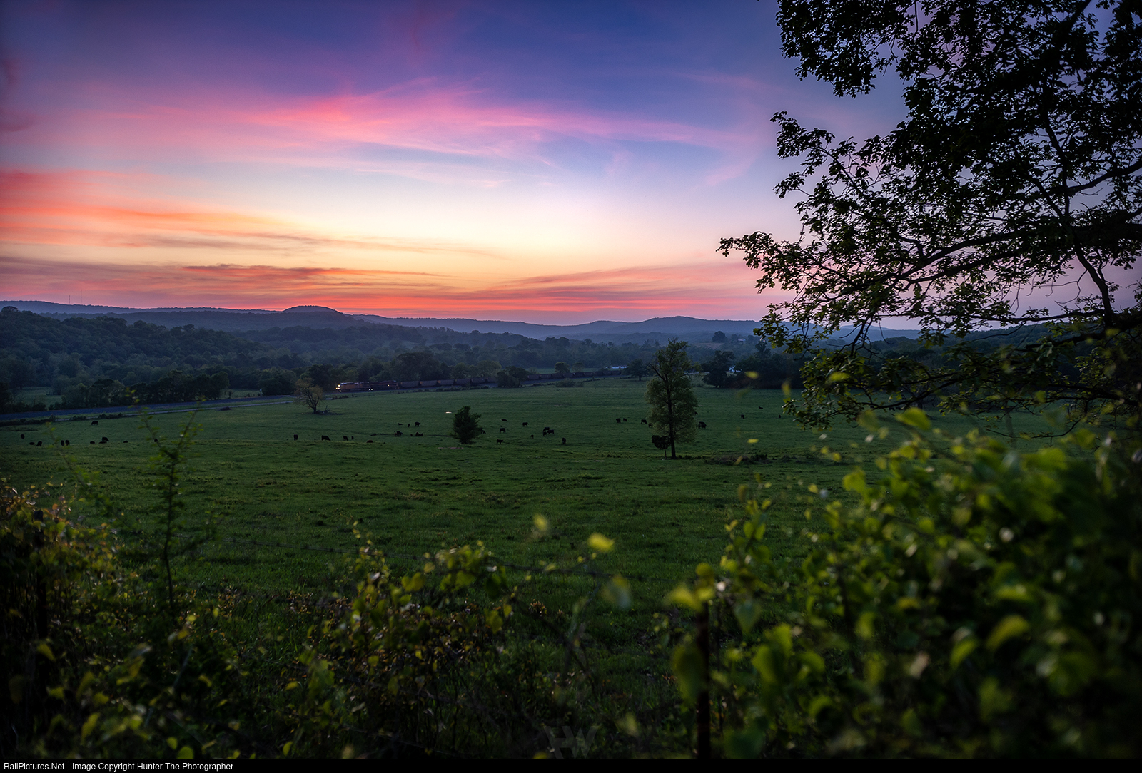 | Blues, oranges, and pinks cast a brilliant glow in the sky above the community of Bunch, OK where a southbound CPKC coal train cruises through the valley between the Ozark Mountains on a mild Sunday, April 27, 2025 evening.
