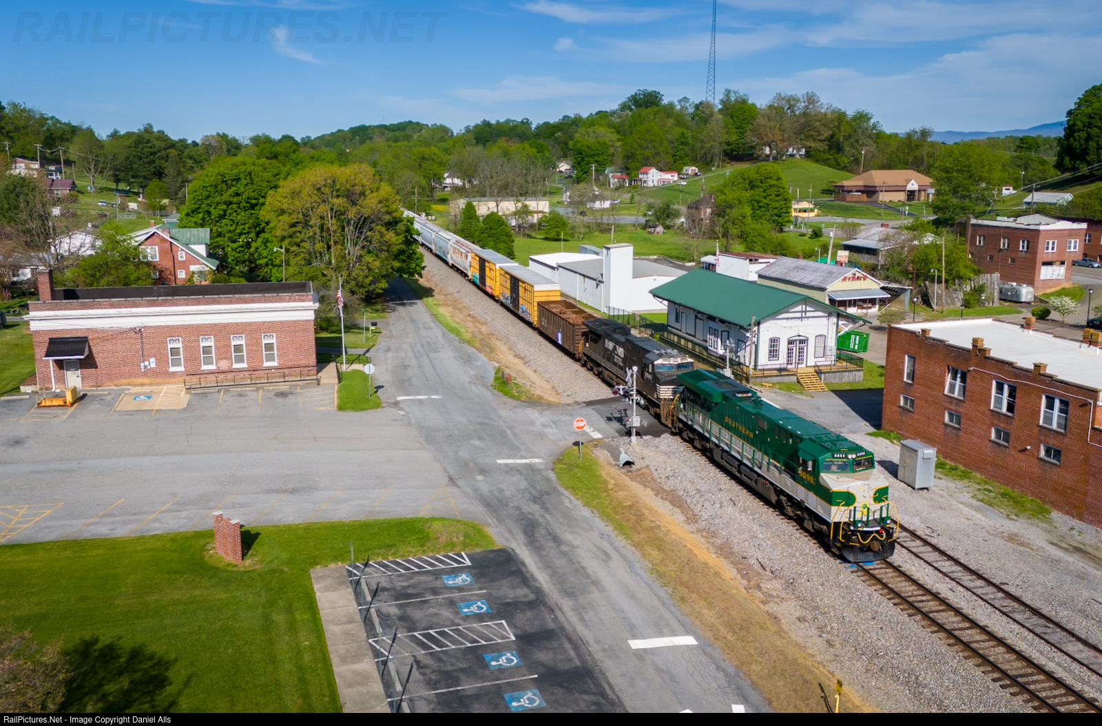 8099 leads NS 15T westbound by the Meadowview depot along the Pulaski district.