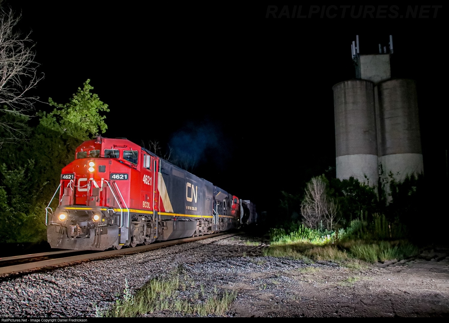 | BCOL 4621 (C40-8M), now wearing CN colors and missing its top set of ditch lights, leads a manifest past the grain silo along Otis Road in Barrington, IL. |
