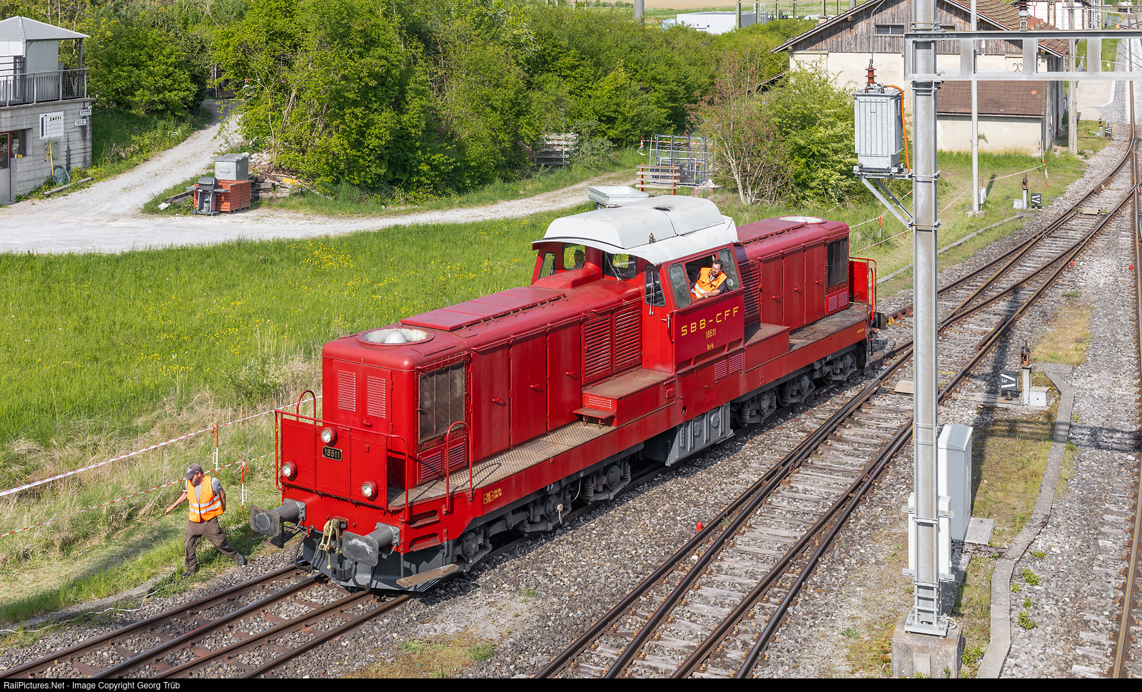 To celebrate 150 years of the Nationalbahn, founded in 1875 and bankrupt a few years later already, there was a large railway event held in Etzwilen this day. Diesellocomotive Bm 6/6 # 18511 of the association Rangierlok Schweiz (VRLS), built in 1961 for the SBB and 2008 withdrawn, taken over by Ralph Schorno, is moving from the station in the siding tracks.