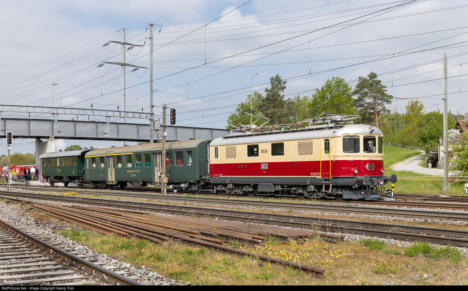| To celebrate 150 years of the Nationalbahn, founded in 1875 and bankrupt a few years later already, there was a large railway event held in Etzwilen this day. The train 31711, organized by Eurovapor, from Romanshorn via Winterthur-Bülach-Schaffhausen is entering Etzwilen. Pulling is Re 4/4 I # 10034 of TEE Classics in the red/cream TRANS EUROP EXPRESS colors. |