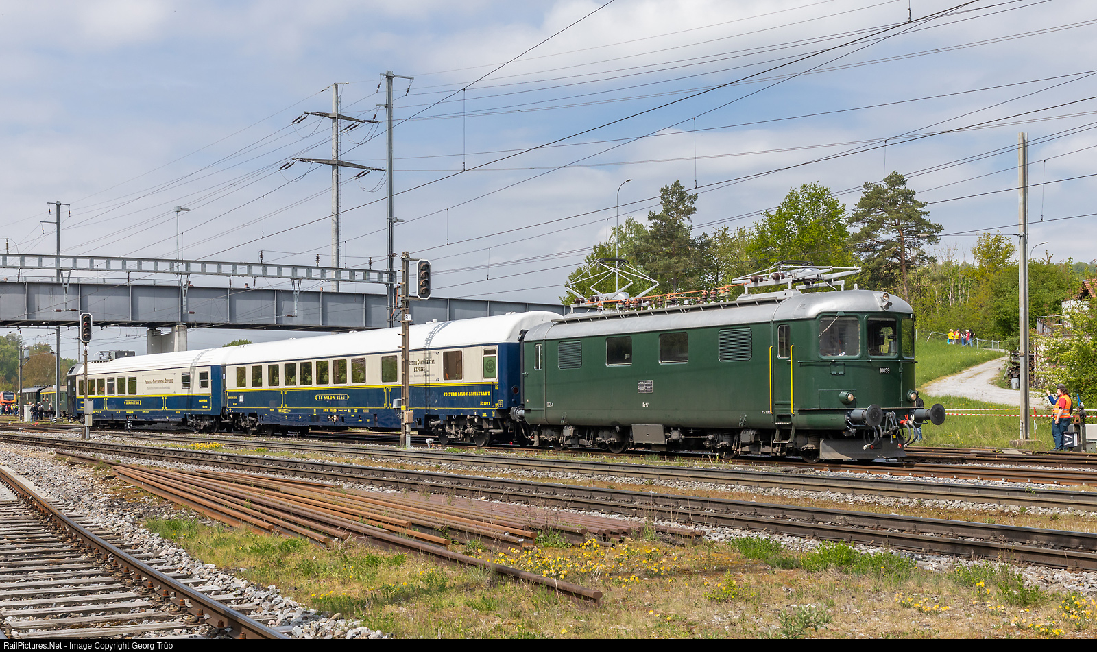 To celebrate 150 years of the Nationalbahn, founded in 1875 and bankrupt a few years later already, there was a large railway event held in Etzwilen this day. The train 31019 of TR TransRail (RailEvent) from Winterthur via Zürich main station-Killwangen-Würenlos-Regensdorf-Bülach-Schaffhausen is entering Etzwilen, with privatly owned former SBB Re 4/4 I # 10039 and two PRESTIGE CONTINENTAL EXPRESS cars of the IRSI AG.