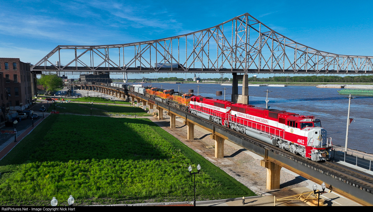 On the elevated portion of the TRRA's Merchants District, train 201 is seen passing under the Martin Luther King bridge at LaClede's Landing, along downtown St. Louis' riverfront. Led by the Terminal's pair of SD60I's, the train originates at their Madison, IL yard and runs to BNSF's Lindenwood Yard in St. Louis' west side. The trailing BNSF GE's are along for the ride.