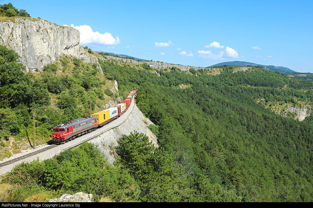 363 032 passes Crnotice while hauling an intermodal train from Koper