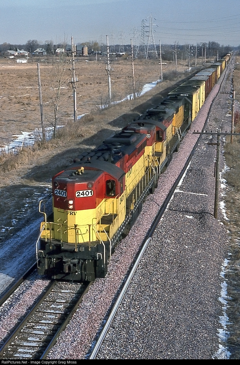 FRVR 2401 is about to duck under Ryan Road in Oak Creek, WI on fine March day in 1990. The train is on CNW's New Line heading from Butler to Proviso Yard. Photos of FRV trains north of Milwaukee on the ex-CNW Air Line were far more common, but these trains added a bit of variety to the CNW power normally seen here.