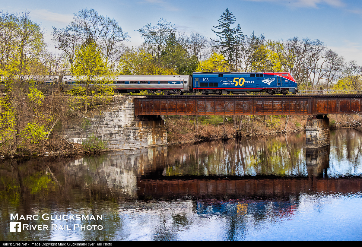 Amtrak At 54. When the National Rail Passenger Corporation started to operate trains on May 1, 1971, you could have won a lot of money on a bet that 54 years later, Amtrak would still exist in any form. Amtrak P42DC 108 was painted in a special Phase VI paint scheme for the railroad's 50th Anniversary, and was leading Train 68 (Adirondack) over the Hudson River Near Rogers Island in Fort Edward, New York, on the afternoon of April 27, 2025. The Delaware & Hudson Railroad discontinued this train in 1971, but it returned in 1974 as part of the Empire Service that was subsidized by New York State. Though it has seen some extended outages, it currently operates round-trip daily between New York City and Montreal.