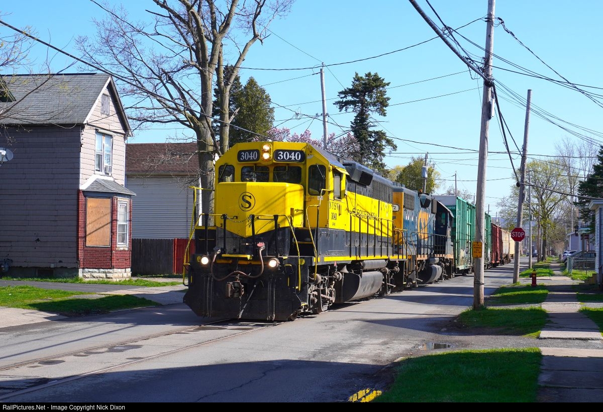 NYS&W's Utica Branch freight, UT-1, is nearing the end of the roughly half-mile segment of street-running on Schuyler Street. Spring brings a big traffic surge to the feed mills at Sangerfield, and so the NYS&W leases CSX power to assist with the extra carloads, in this case CSX GP38-2 2722 behind Utica Branch staple 3040.