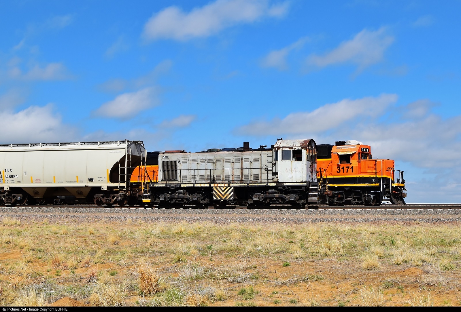 Hudson Terminal Railroad's Alco S1 passes a pair of BNSF motors waiting to take a cut of oil cans from the terminal to Denver, Colorado.