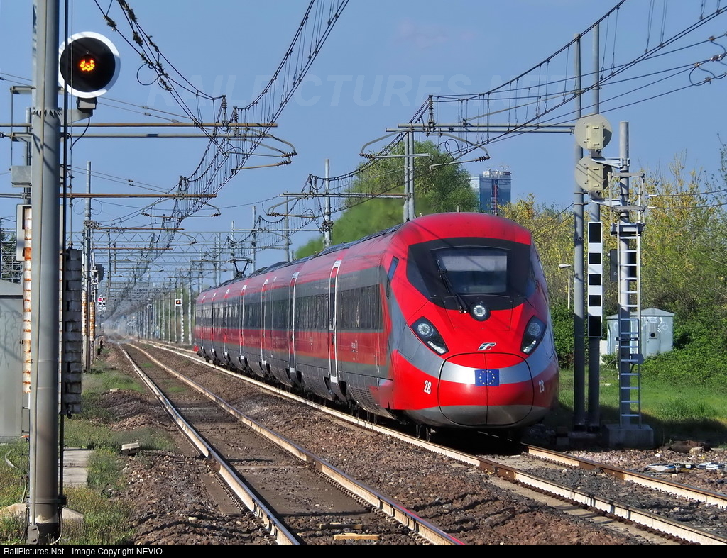 | In this photo one of the Frecciarossa 1000s transformed for the international service Italy - France in fact bears the emblem of the European flag on the lower front. Modified together with some others with regard to the specific signalling for the French network as well as modifications to the electrical part to be able to travel under the catenary of the two nations. |
