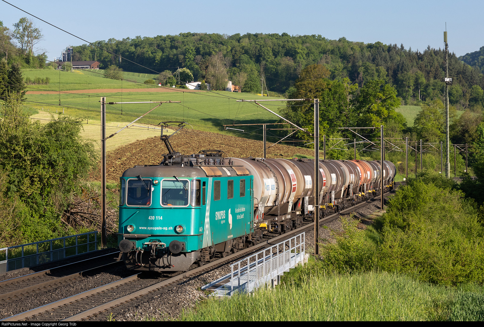 | Re 430 # 114 of the Widmer Railway Services (WRS) in the "Synopsis" paint scheme pulls the loaded tank car train 69629 from Basel Birsfelden Hafen via Bözberg to Altdorf, between Hornussen and Effingen. |