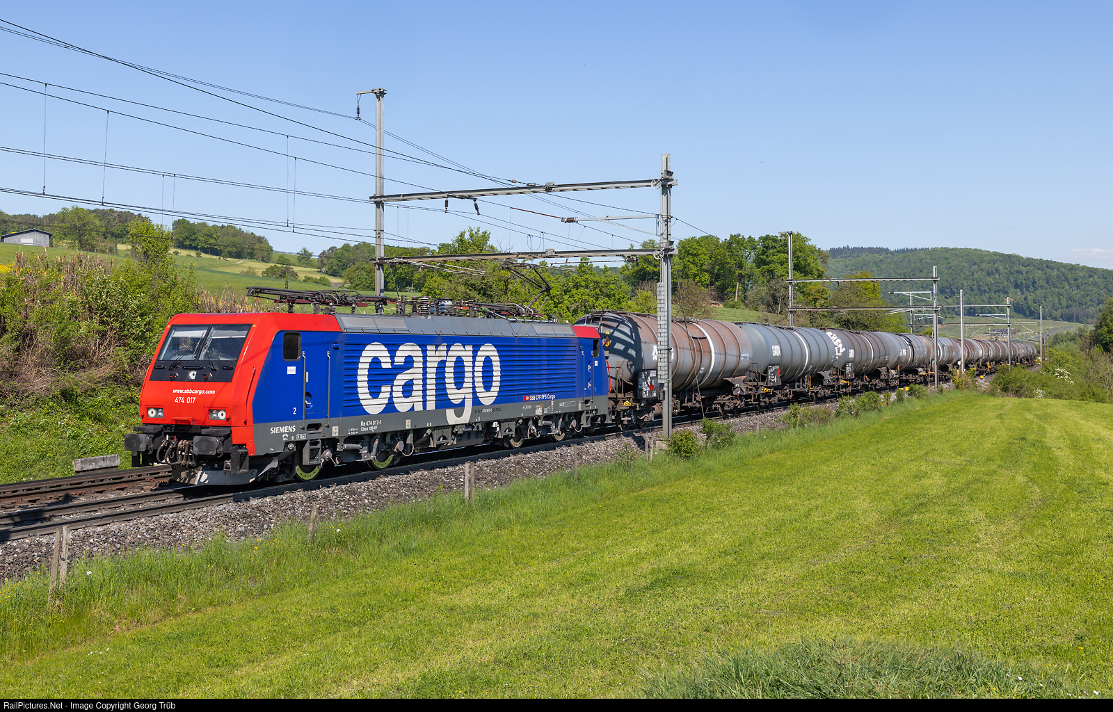 | Siemens ES64 F4 Re 474 # 017 of SBB Cargo International, rented to LTE Schweiz, pulls the 1870 ton tank car train 40797 from Basel Badischer Bahnhof via Bözberg-Zürich Altstetten-Thalwil-Ziegelbrücke-Sargans-Buchs SG to Salez-Sennwald, between Hornussen and Effingen. |