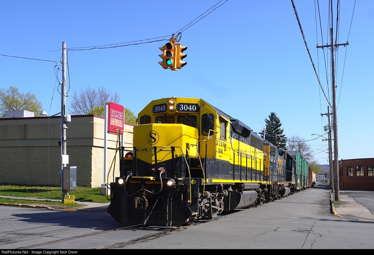NYS&W's Utica Branch freight, UT-1,NYS&W's Utica Branch freight, UT-1, passes under a traffic light as it traverses the famed half-mile segment of street-running on Schuyler Street. Spring brings a big traffic surge to the feed mills at Sangerfield, and so the NYS&W leases CSX power to assist with the extra carloads, in this case CSX GP38-2 2722 behind Utica Branch staple 3040.