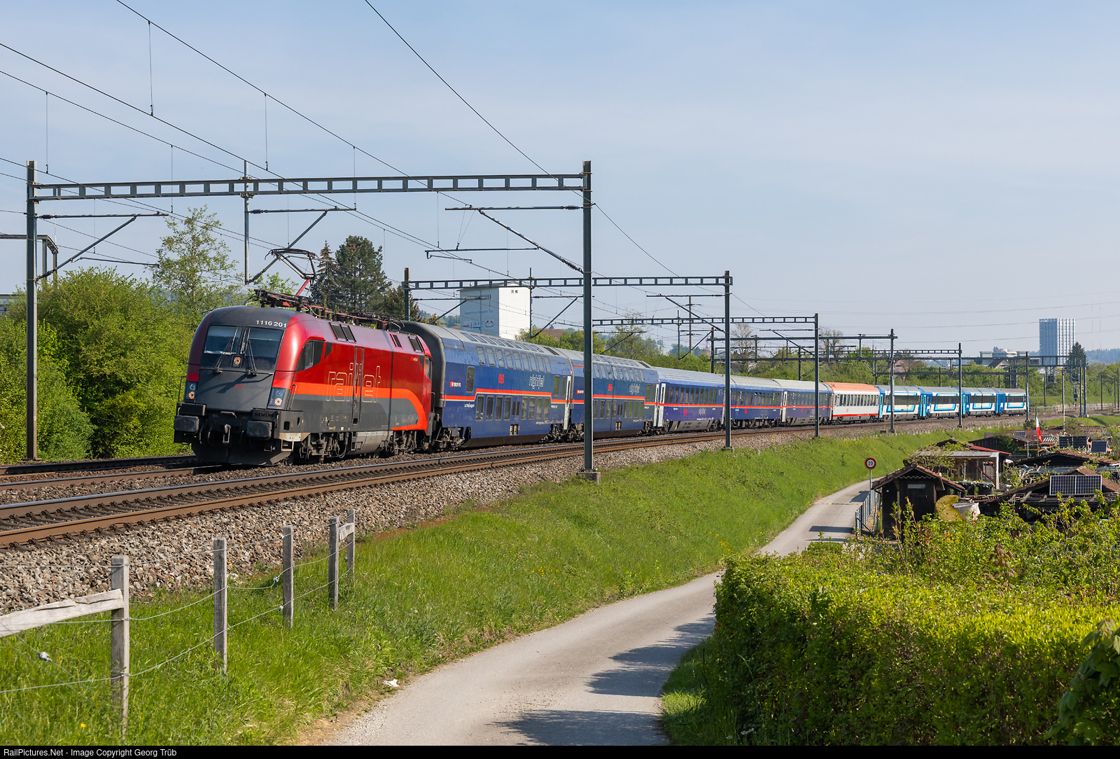 | Locomotive 1116 # 201 of the austrian ÖBB pulls the NightJet NJ 436 from Vienna to Zürich, rerouted via Munich-Lindau Reutin-Bregenz-St.Margrethen-Romanshorn VL-Frauenfeld between Winterthur and Winterthur Tössmühle. In the rear are the cars from Budapest. |