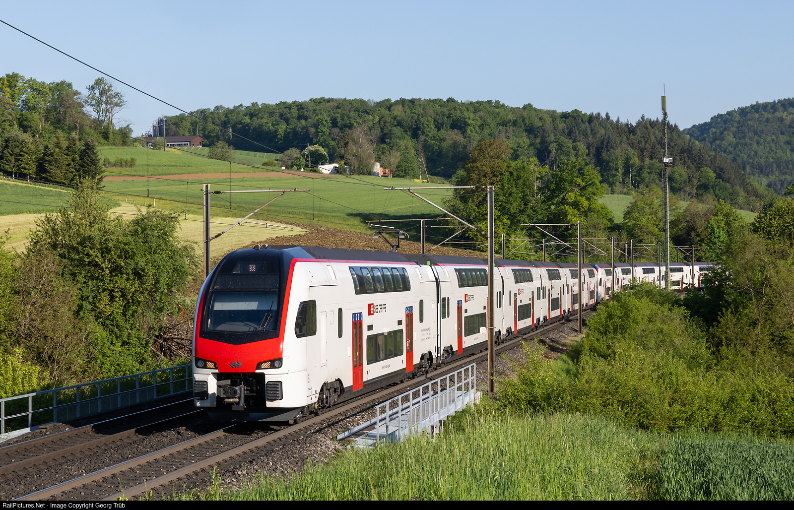 The SBB ordered 60 doubledeck trains "IRD" for Interregio services from StadlerRail, about 40 are delivered now. RABe 512 # 038 and # 006 in multiple control are running the IR 2061 of the line IR36 from Basel via Rheinfelden-Frick-Brugg-Baden-Dietikon-Zürich Altstetten-Zürich HB-Zürich Oerlikon to Zürich Airport, between Hornussen and Effingen.
