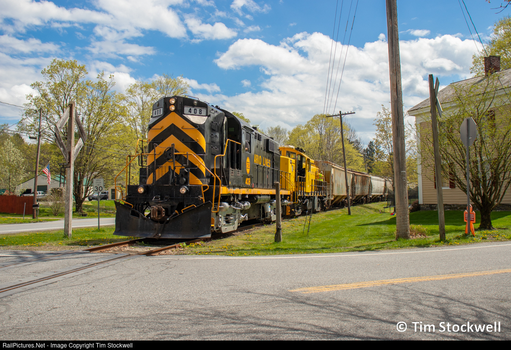 | A Long Way from the Ontario Midland: Former Ontario Midland Alco RS-36 #408 is quite far from its previous railroad as it leads Batten Kill Train BK-F north through Shushan, NY. The engine -- now owned by Southern New England -- is currently being used on the Batten Kill. |