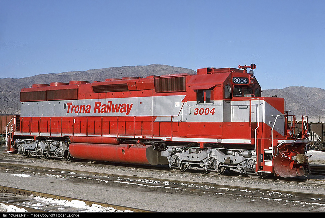 | The Trona Railway locomotive roster in 1993, 1 SW1200, 1 SD9 and 6 SD45-2 (rebuilt by Alstom as SD40-2M) numbered 3001-3006.