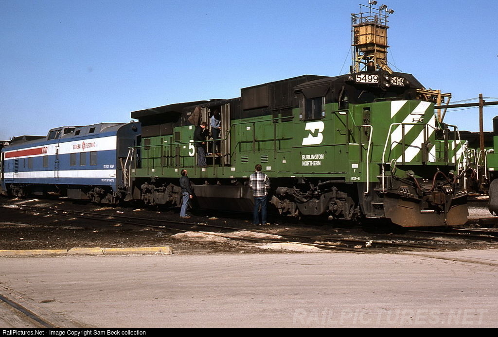 | GE painted three B32-8s into Burlington Northern colors for testing by BN in the mid-1980s. Numbered 5497-5499, the three unit consist is seen undergoing a mechanical inspection. Tom Golden photo. |