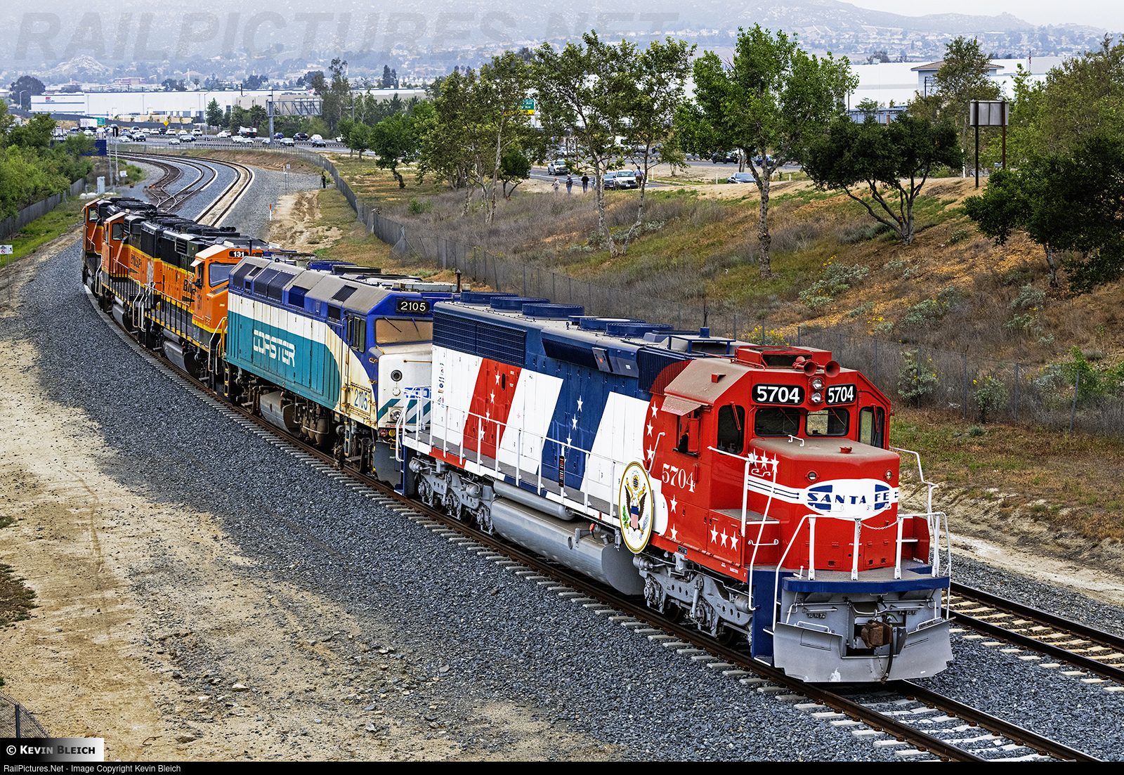 Nearly three years since they were first stored at BNSF's Commerce Diesel Facility near Los Angeles, Santa Fe Bicentennial SD45-2 and Coaster F40 2105 finally commenced their journey to their new home at the Southern California Railway Museum in Perris, CA. The long-awaited move finally became a reality when temporary panel track was able to be laid connecting the Metrolink Perris Valley Sub with the SCRM museum tracks. About 10 miles from their destination, the BNSF GP60Ms were run around the train so that the equipment could be shoved in, making it appear as if the 5704 was "leading" the train.