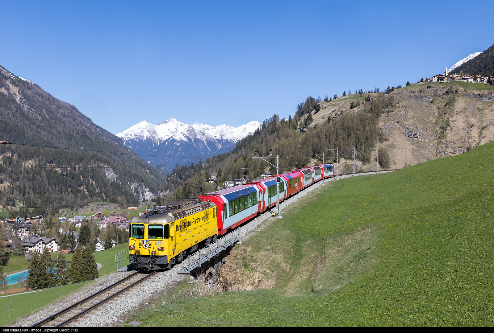 | Ge 4/4 II # 612 of the Rhaetian Railway in the Burkhalter group publicity paint scheme pulls the PE 905 GLACIER EXPRESS St.Moritz-Zermatt on the leg till Chur, between Muot and Bergün on the Albula line, with the village of Latsch right above. |