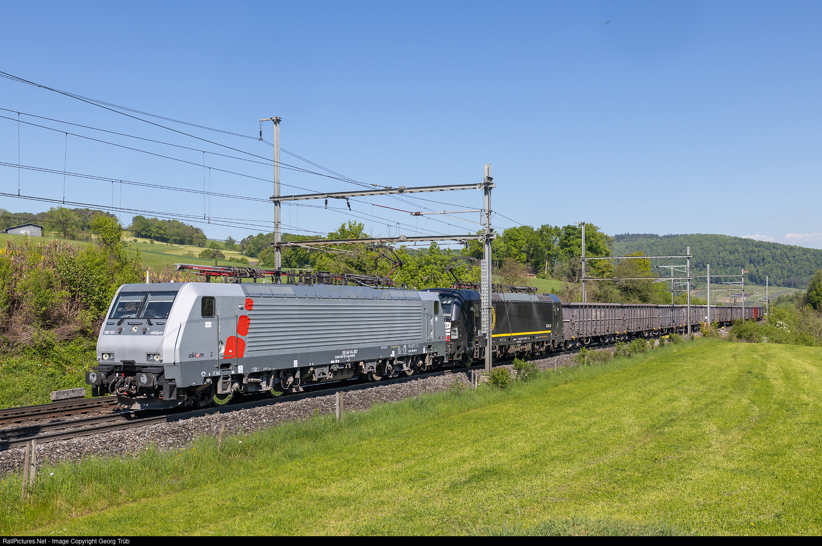 | Freight train 40783 of the Medway company from Basel Badischer Bahnhof over Bözberg, Gotthard and Ceneri base tunnels to Chiasso shunting yard, between Hornussen and Effingen. Pulling are Siemens ES64 F4 # 107 (189 # 107) of the Akiem and Siemens "Vectron" 193 # 651 of the Beacon Rail in multiple control. Train load was about 1700 ton. |