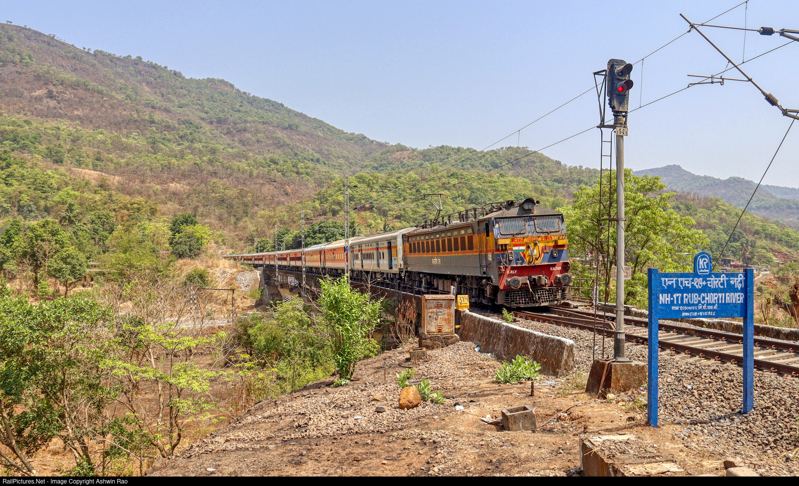 10105 Diva Sawantwadi Road Express hauled by WCAM3 #21960 slows down over the Chorti rover bridge to enter the loop at Diwankhavati Railway Station.