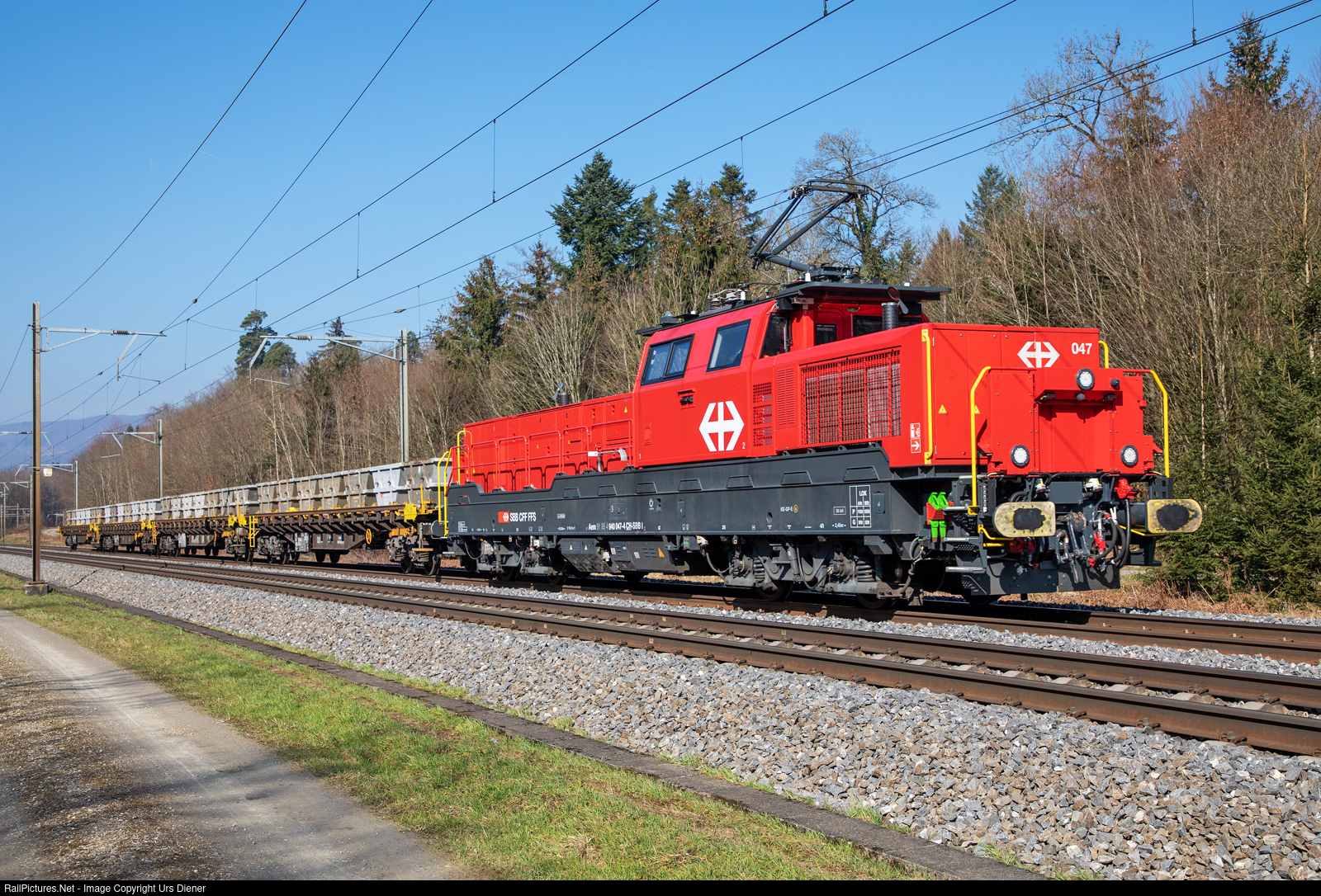 | Dual power locomotive (electric and diesel) Aem 940 047 of the SBB division infrastructure between Rupperswil and Lenzburg with four flat cars loaded with swap bodies for gravel. |