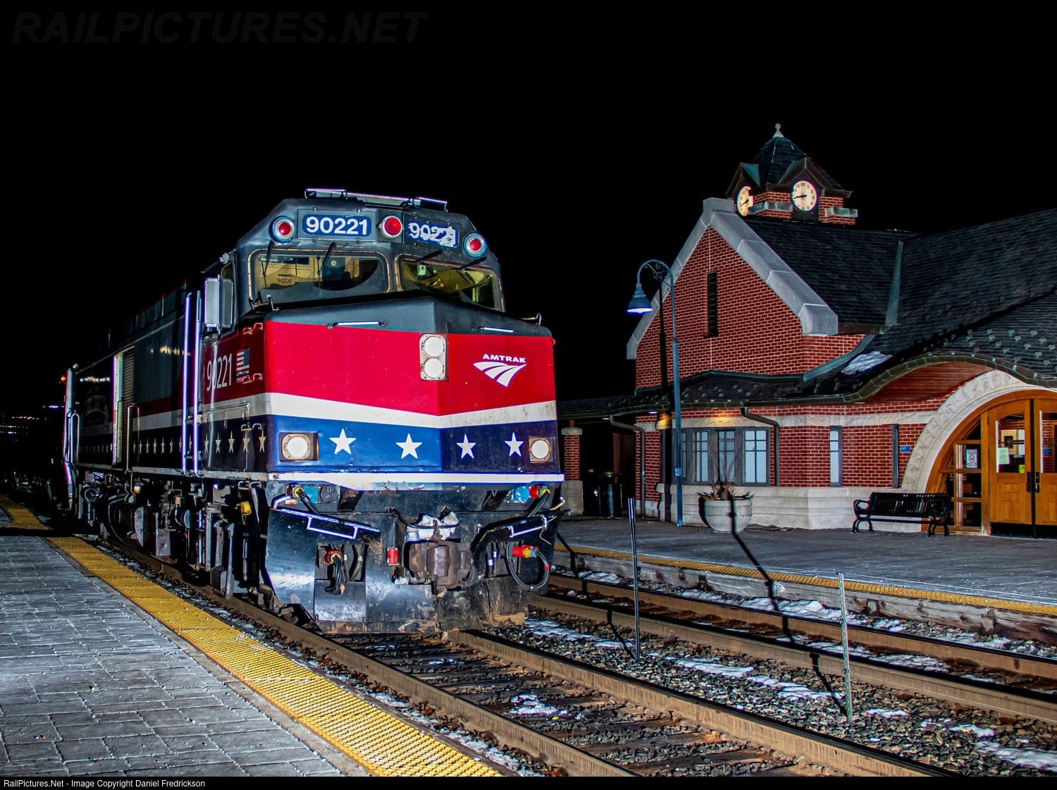 | Amtrak NPCU #90221, wearing a stylized Veterans tribute scheme, glides into the Glenview, IL Amtrak station with southbound Hiawatha train 342. |