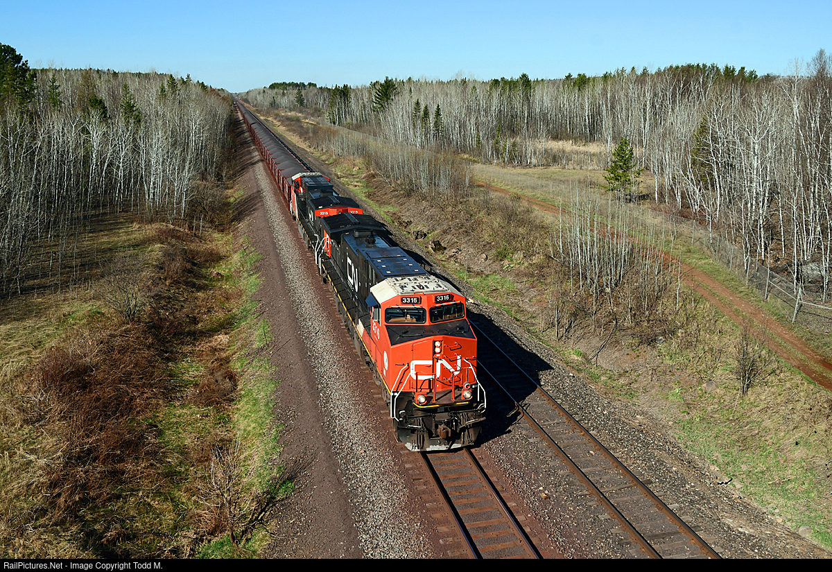 | A bluebird weather day on this Monday morning as Minntac marbles glide along behind two AC44C6Ms that are pulling them south on the CN Iron Range Sub aiming for the dock at Two Harbors, MN. |