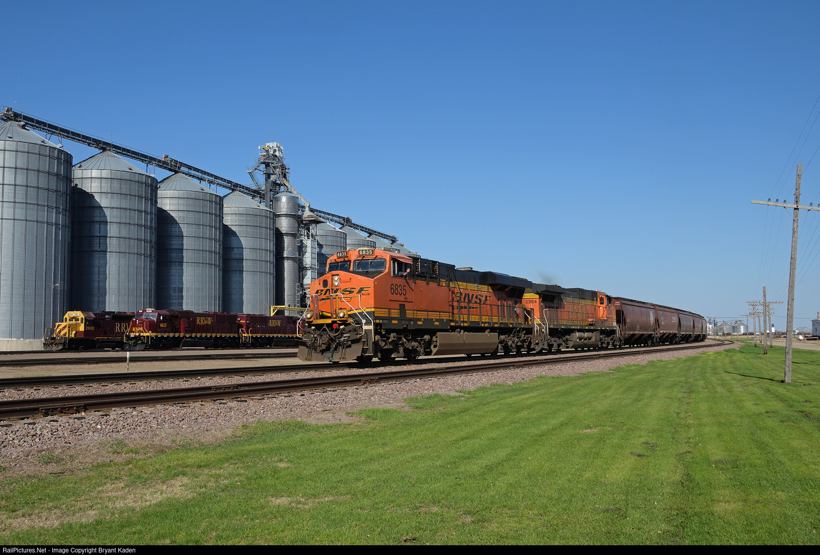 | A westbound BNSF grain train passes some Red River Valley & Western power in Breckenridge, MN on a perfect spring evening, with the conductor giving a friendly wave. |