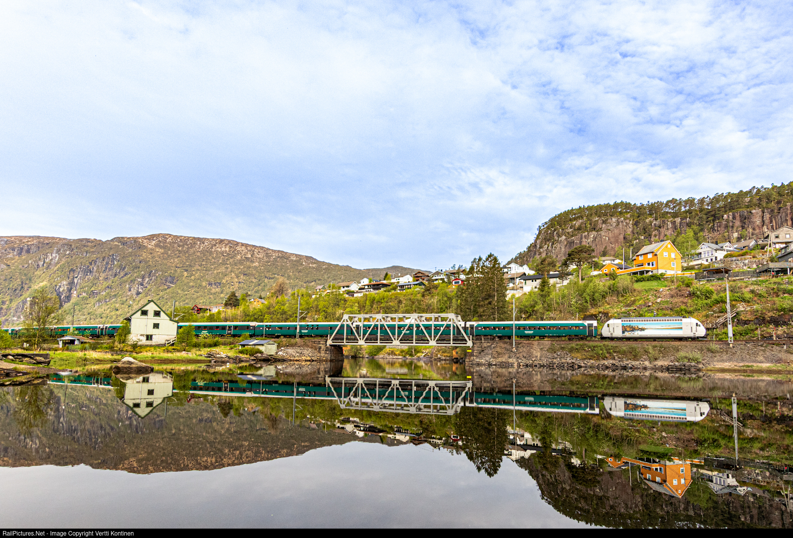 | The morning sun shines it's first rays to the town of Stanghelle when the first long distance train of the day from Bergen to Oslo passes the calm scene. Pulling the train is El18 class electric number 2248 |