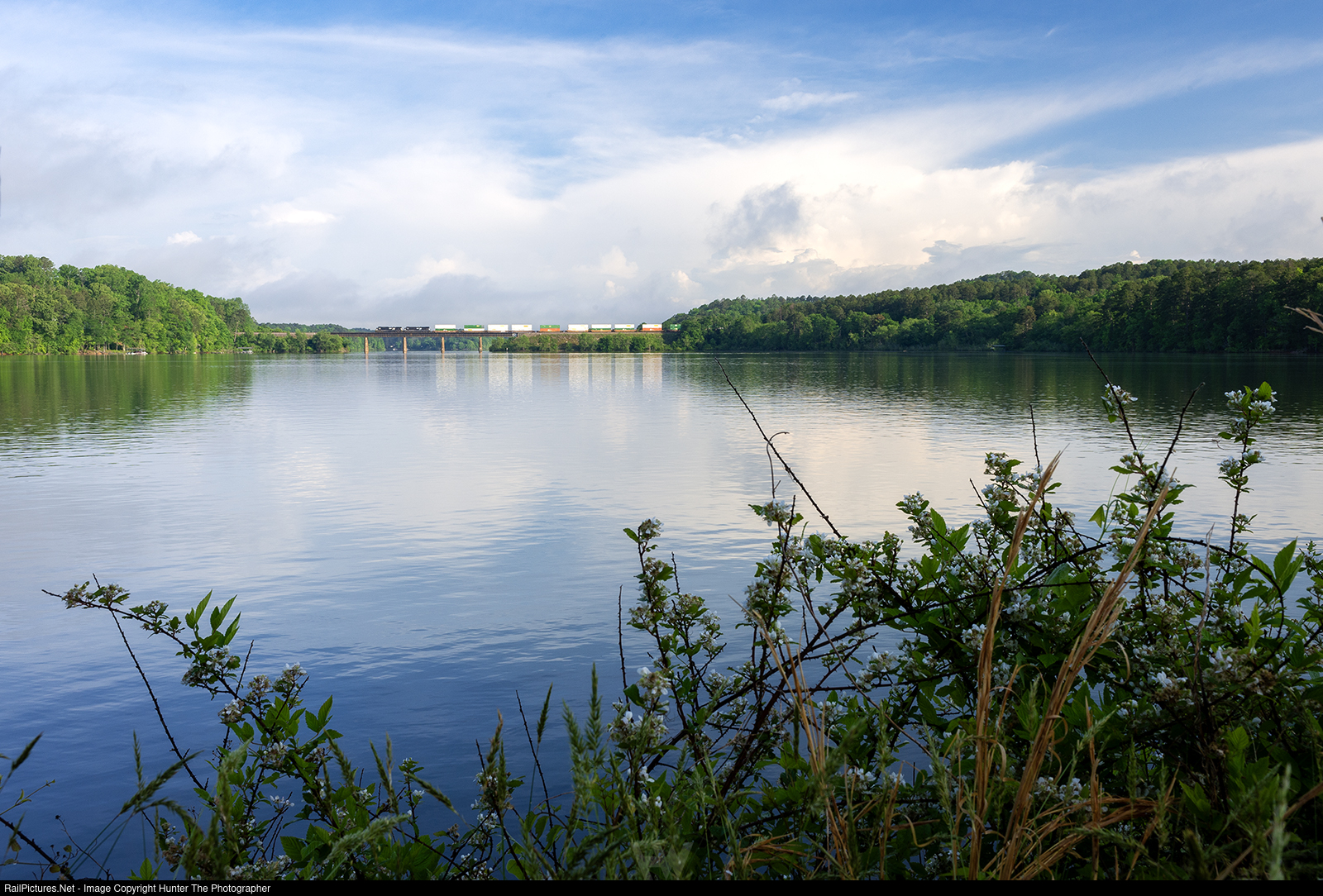 Railroading At The Lake | Southbound Norfolk Southern intermodal train 27A crosses from South Carolina into Georgia over the Tugaloo River at the western tip of Lake Hartwell near Toccoa, GA on a sunny Friday, May 2, 2025 morning. Having started in Rutherford, PA, 27A is nearing the end of its journey down the line in Atlanta.