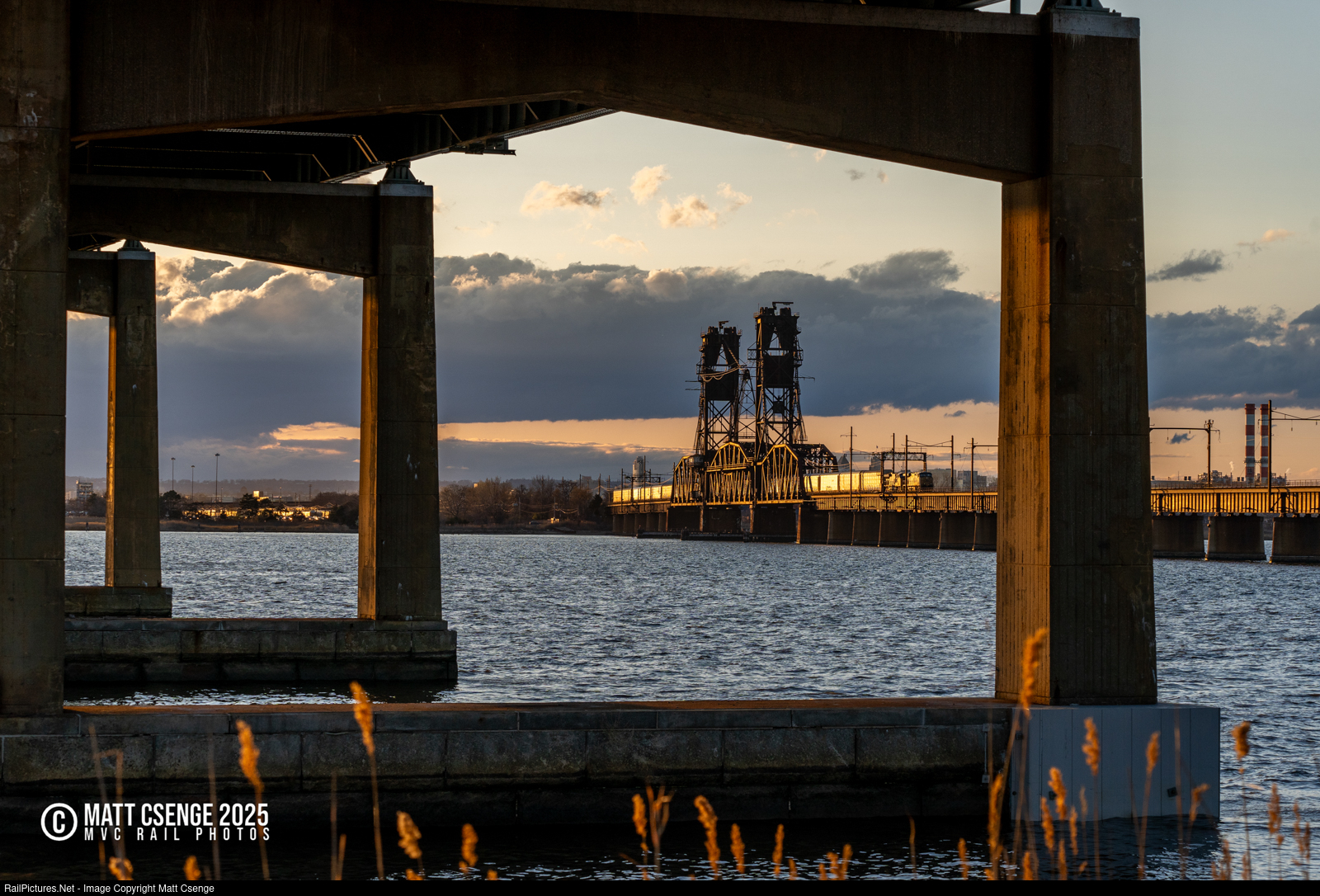 A Conrail Shared Assets Operations (CSAO) train is seen taking headroom across the Upper Bay Bridge as it switches tracks within Oak Island Yard, as seen through the piers of the Newark Bay Bridge. The former was constructed in 1930 by the Lehigh Valley Railroad and carries two tracks across Newark Bay, while the latter was built in 1956 and carries four lanes of Interstate 78. |