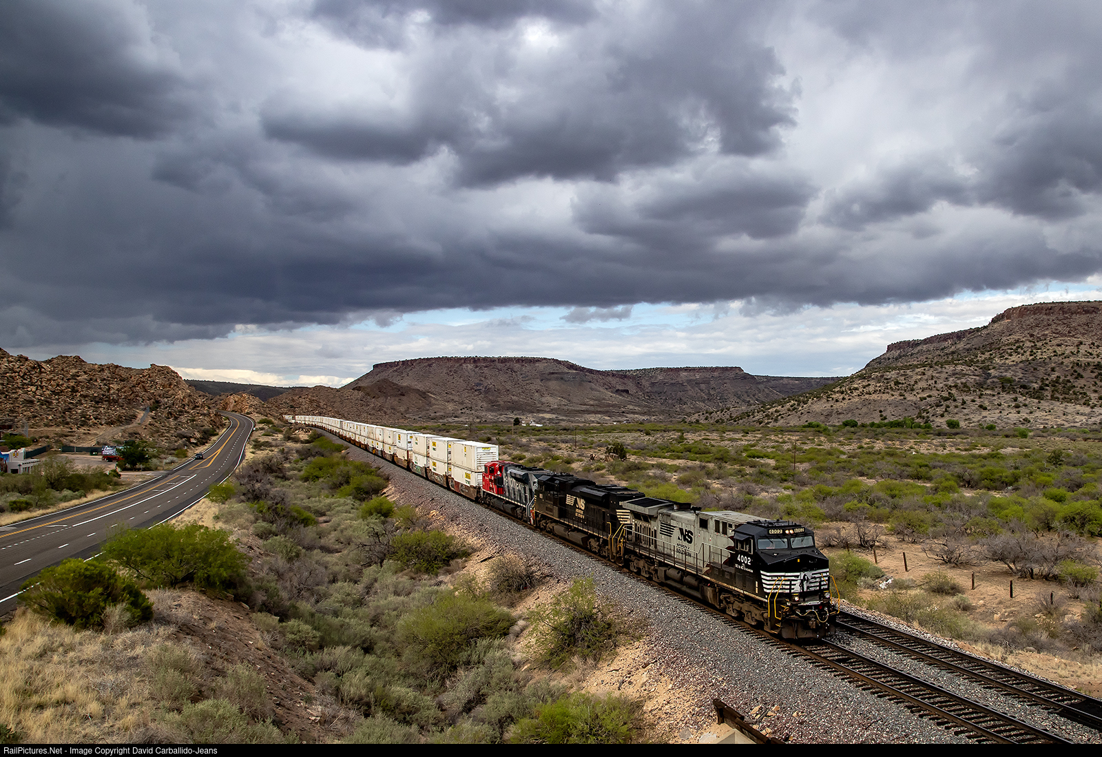 NS 4002, one of Norfolk Southern's DC to AC rebuilt locomotives, descends down the grade between Crozier Canyon and Valentine as it leads a San Bernardino, CA bound Z-train. Unlike Norfolk Southern's other AC44C6M locomotives, NS 4002 is painted in a black and silver paint scheme to represent it being one of the first locomotives to be rebuilt for Norfolk Southern's DC to AC project.