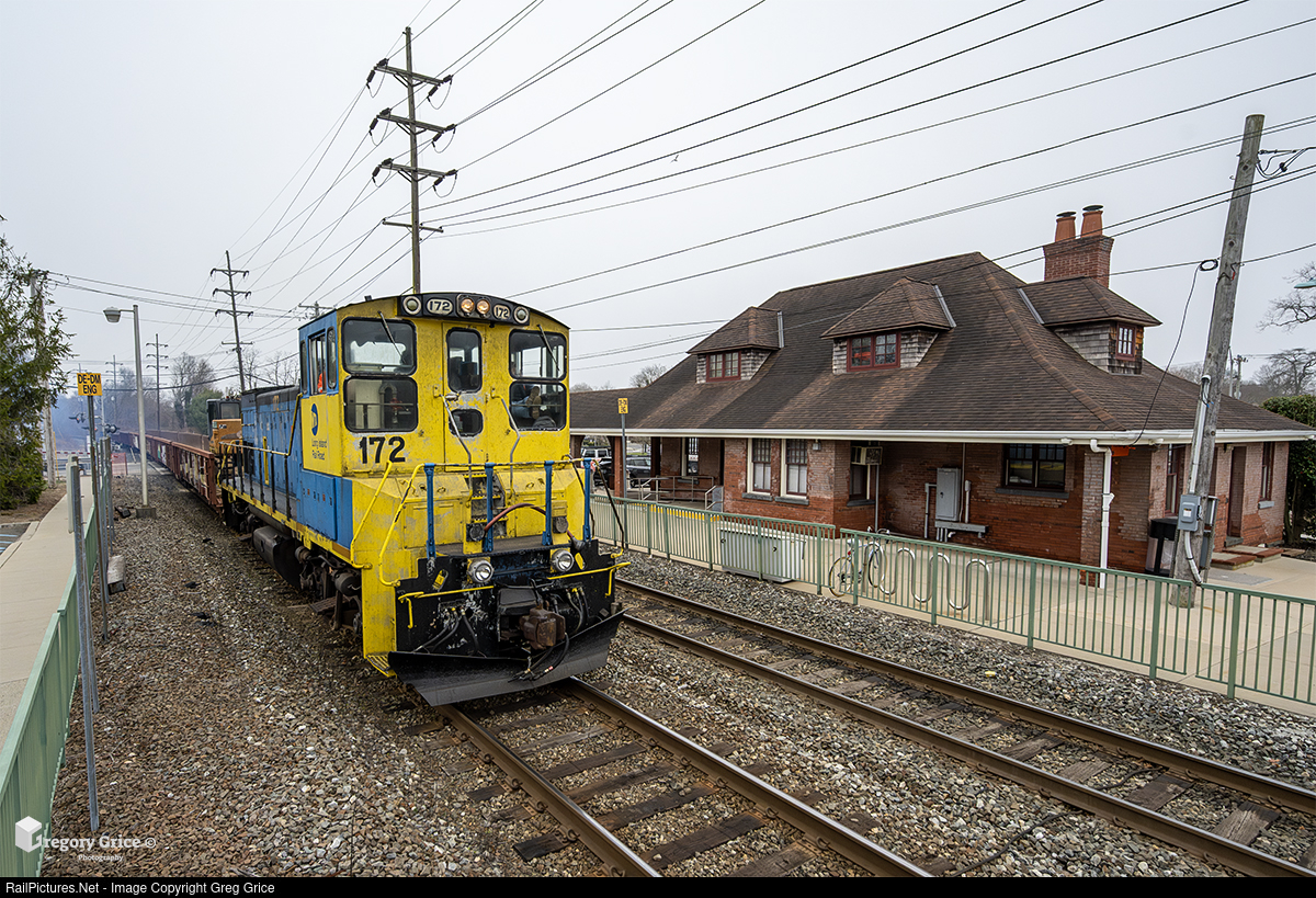 On a foggy March 31st, 2025, Long Island Rail Road Extra 172, with MP15AC 172, covers Oakdale-Bohemia Road in smoke as it tows a short gondola rail train past the station at Oakdale, New York on the Montauk Line.