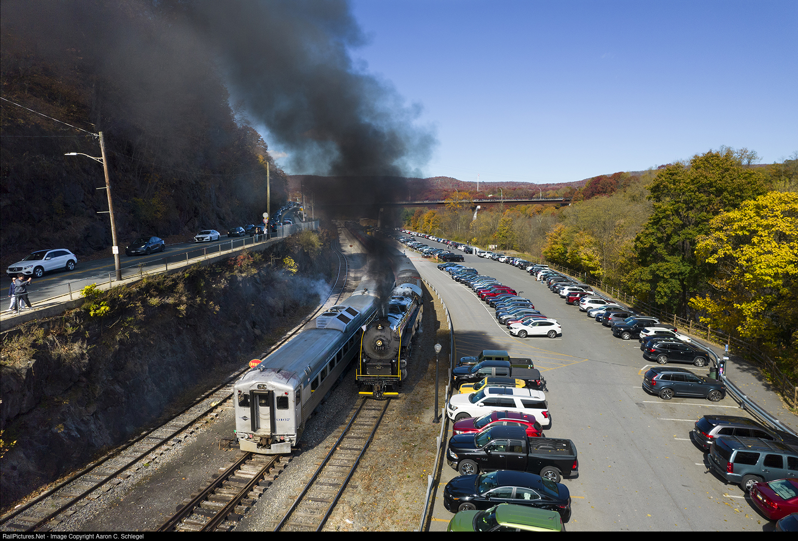 | The Mighty 2102 shoves the OSJT train back for the WYE as the trip from Pittston pulls into the Jim Thorpe station. The Pittston to Jim Thorpe trip was abord the RDC's and 2102 headed up the trip from Reading. This scene is reminiscent of the transition days of Steam to Diesel. |