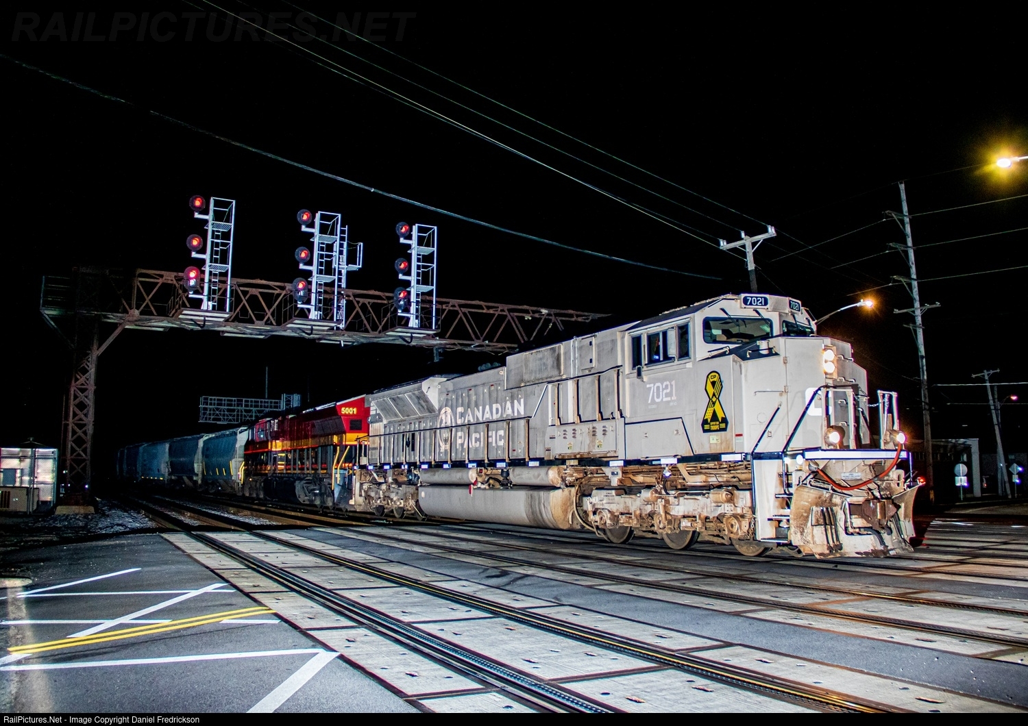 CP 7021, CPKC's "Army Arid" commemorative SD70ACU, arrives in Franklin Park, IL with train 3-231 from Canada, nearing its journey's completion at Bensenville Yard just ahead.