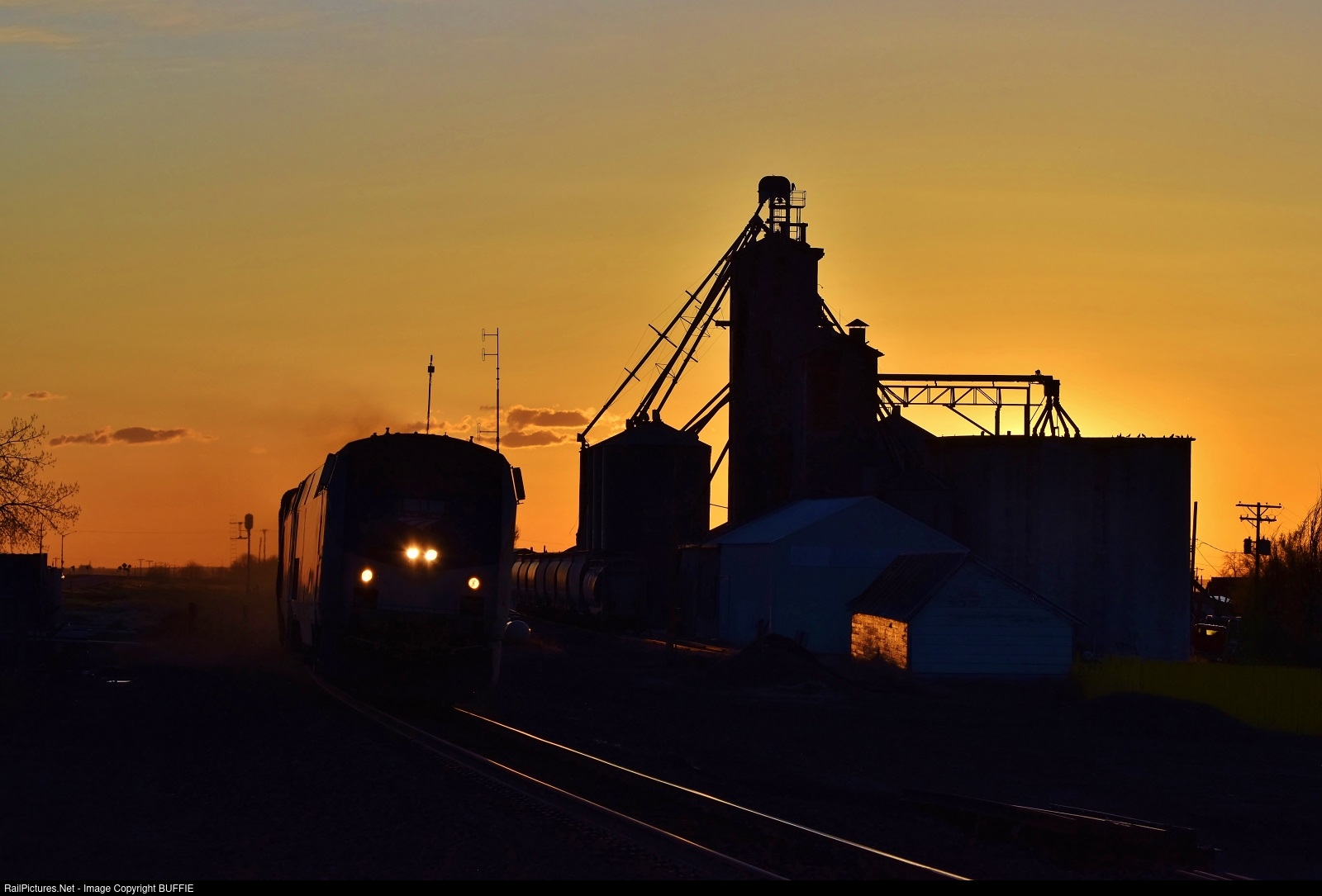 | The California Zephyr leans into the elevated curve at sunrise as it runs 70 mph through Keenesburg, Colorado.