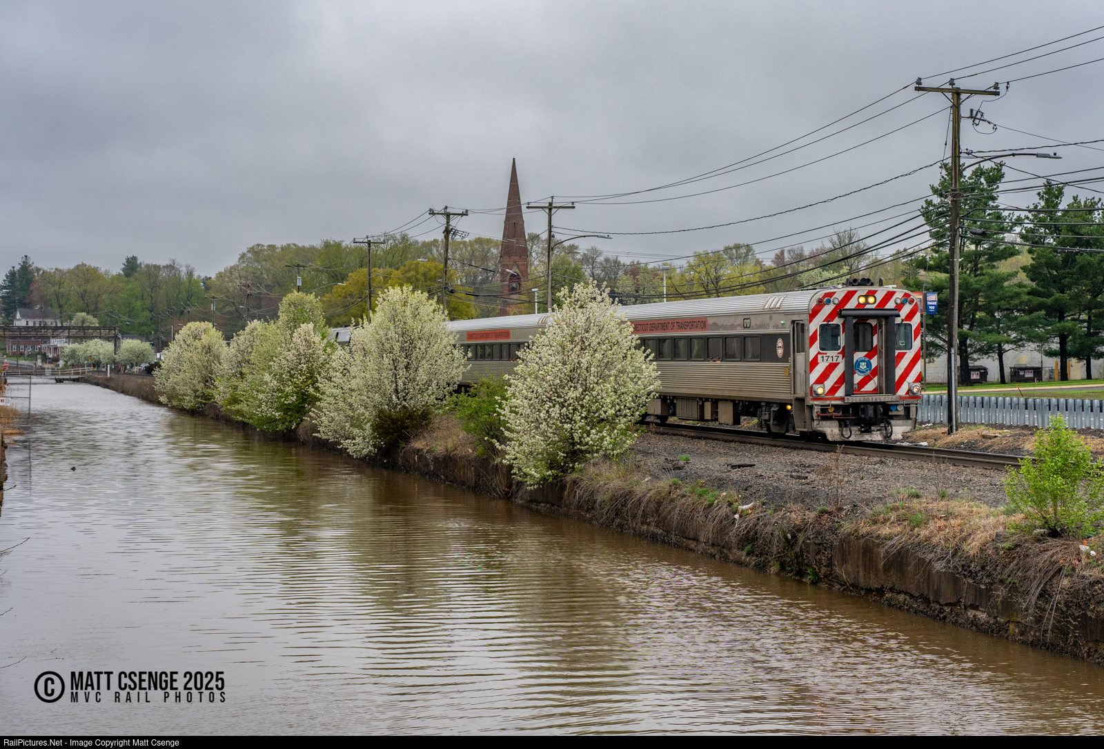 CTrail Mafersa cab car 1717 is the lead unit on Hartford Line train 6402 seen cruising through Windsor Locks, CT along the shore of the Enfield Falls Canal. |