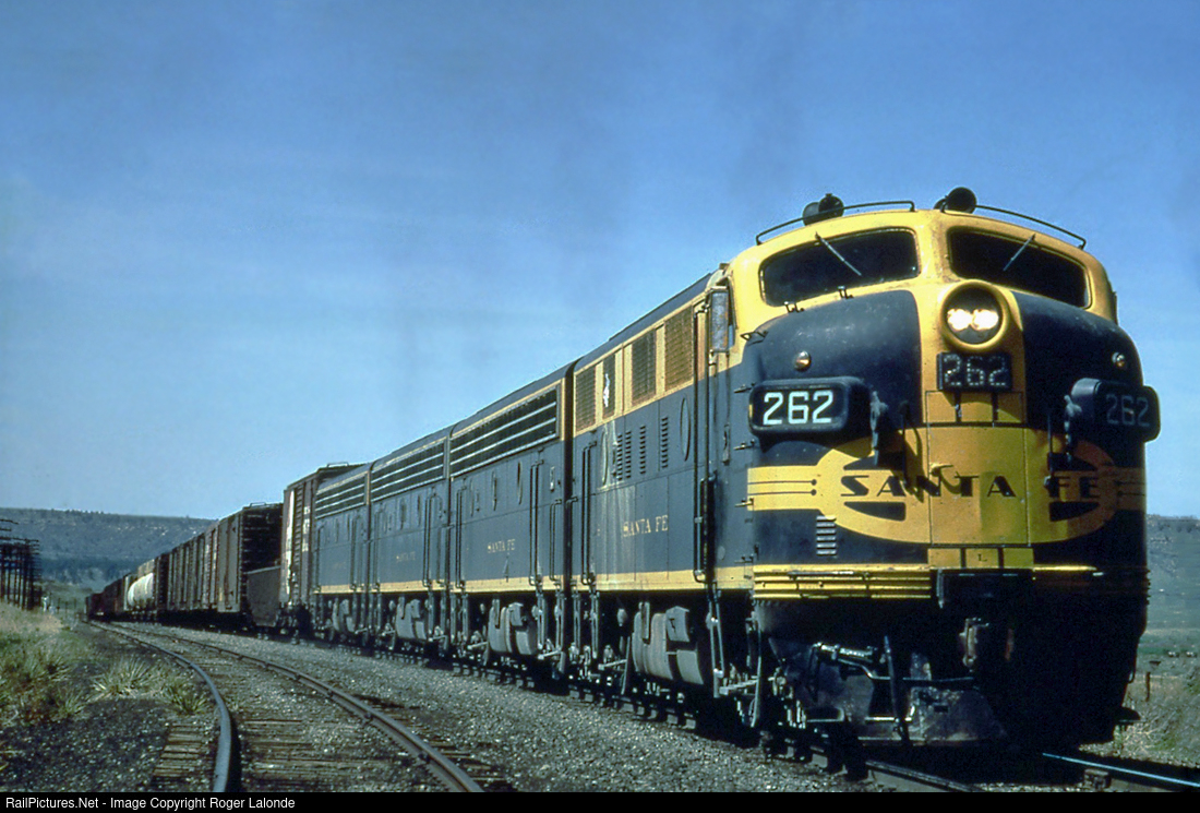 A four unit consist of F-units headed by Santa Fe F3A 262 and three F7Bs moves No.31 on the grade at Larkspur, Colorado. Only 8.6 miles remain to the Palmer Lake summit, as the diesels are in the eighth notch to combat the tonnage, on June 9, 1967. Photo by Ken Crist, from my collection.