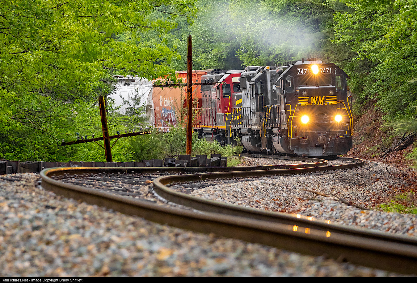 | A symphony of howling EMD 645’s rings out through rural Buffalo Gap, VA, announcing the mountain local’s arrival as WM 7471 leads the train’s assault on North Mountain Grade. |