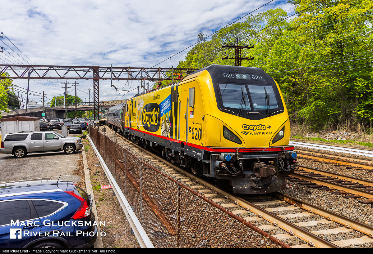 A Dandy Dandelion. On the morning of Thursday, May 8, 2025, AMTK 620 (ACS-64) made its debut on Train 172 in a special Crayola-sponsored wrap. The locomotive is seen passing through Rye, New York. On the side, the color is identified as "Dan D. Dandelion" and "Back For A Limited Time" as an "unretired" product. The Crayola wrap is temporary and will operate in service on various Northeast Corridor trains, so go trackside and try to catch it soon!