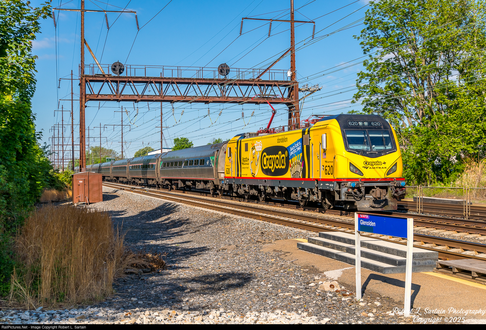 To celebrate the restoration of eight previously retired crayon colors, Crayola commissioned a motor wrap with Amtrak. On May 8 ACS-64 #620 made its first revenue run wrapped as Crayola Dandelion. The motor leads Northeast Regional train 172(08) past the Glenolden SEPTA station on a lovely spring morning.