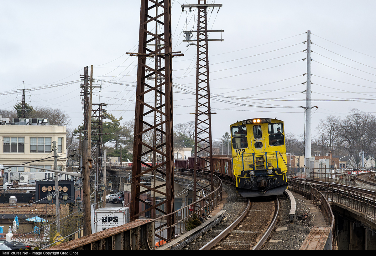 On March 31st, 2025, Long Island Rail Road Extra 172, with MP15AC 172, rounds the curve at Lynbrook, New York as it tows a short gondola rail train west down the Montauk Line.