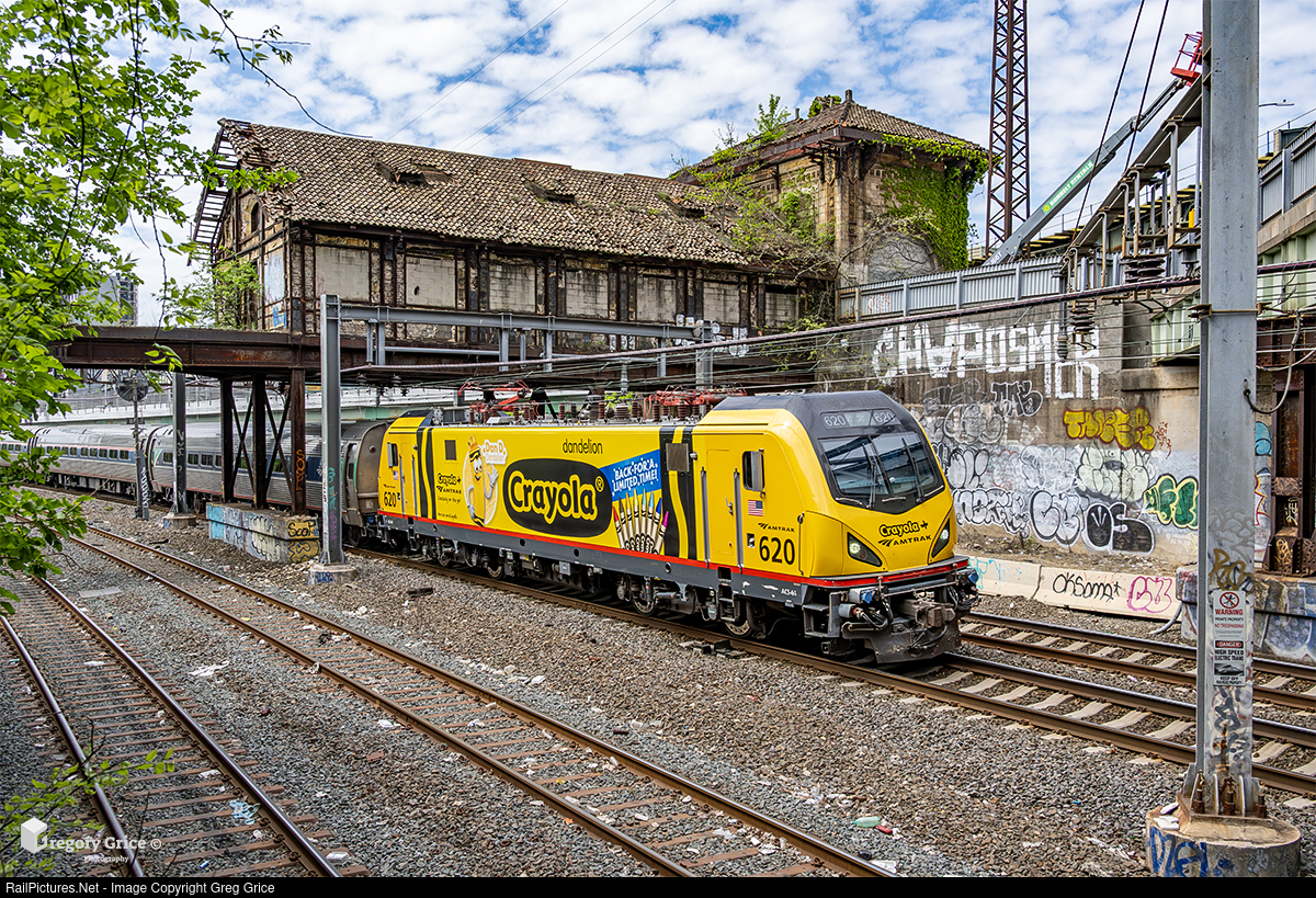 On the evening of May 8th, 2025, Amtrak's Crayola-wrapped ACS-64 #620 makes its debut run leading Regional Train 172 east under the abandoned NYW&B Westchester Avenue Station on the Hell Gate Line in the Bronx borough of New York City. 620 is one of two locomotives wrapped in special Crayola schemes as part of a partnership to promote family travel and creative exploration. This unit features the color Dandelion, a golden yellow and one of the fan-favorite crayon colors brought back from retirement, and stars crayon character "Dan D," the Crayola Ambassador of Creativity.