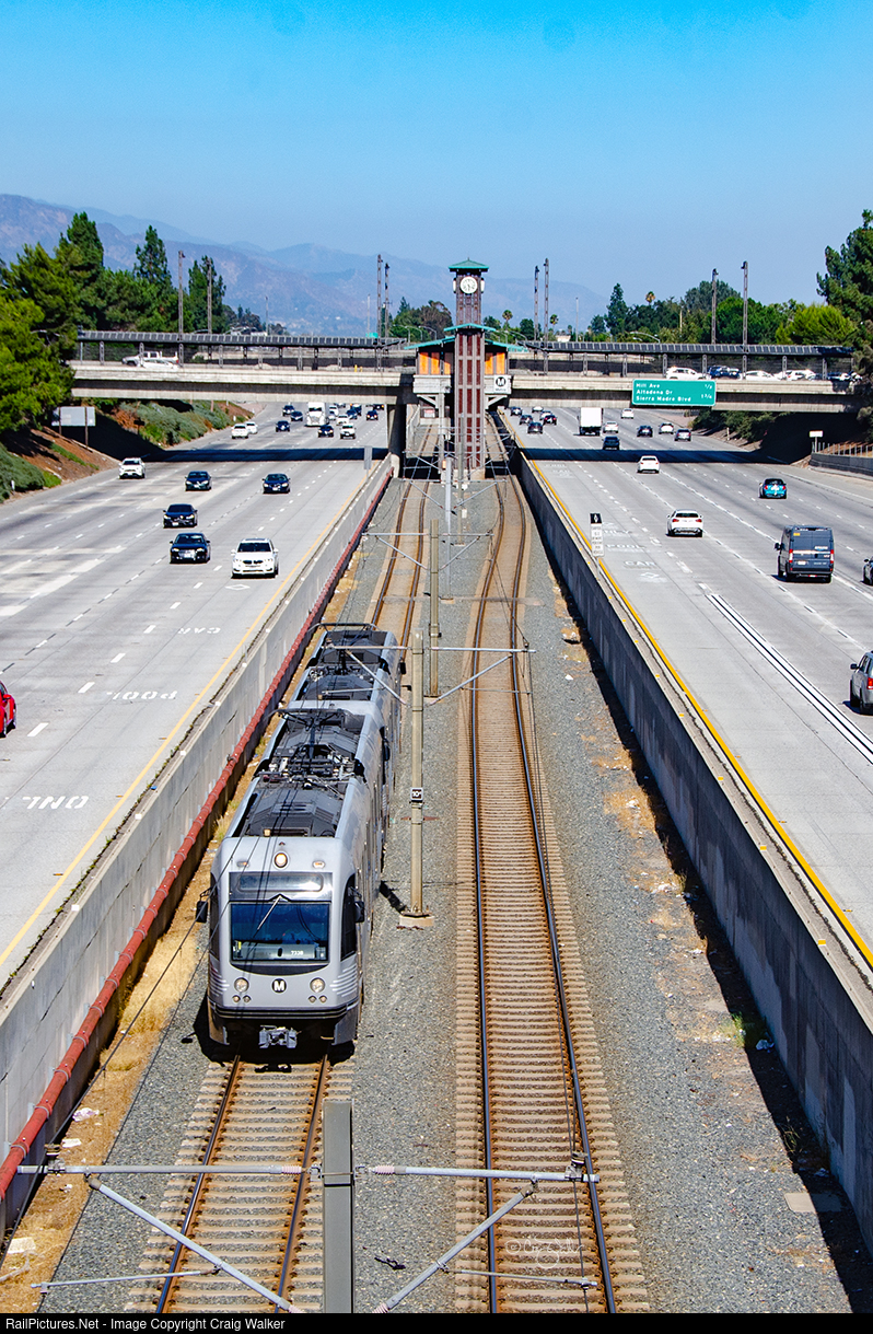 Departing the Los Angeles County Metropolitan Transportation Authority "L Line" (formerly the "Gold Line") Lake Station, located in the median of Interstate 210, below Pasadena's North Lake Avenue, is LACMTA P2550 733. This AnsaldoBreda light rail vehicle is heading from Azusa's Azusa Pacific University/Citrus College station to East Los Angeles' Atlantic (Avenue) Station. (Pasadena, California – August 9, 2020)