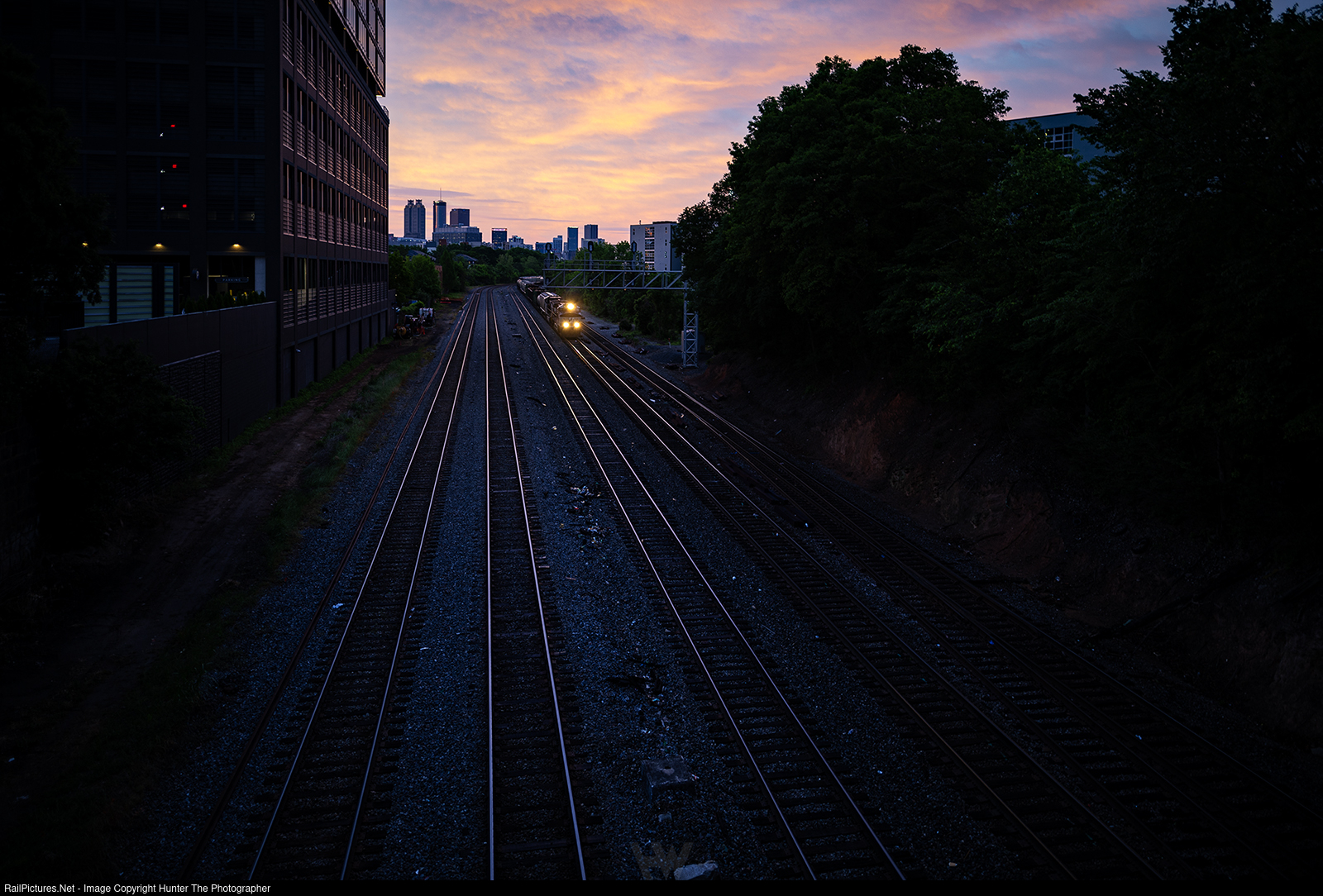 | A 22 year-old dash 9 locomotive leads a Norfolk Southern manifest train through downtown Atlanta, GA early on a calm Saturday, May 3, 2025 morning as it approaches Inman Yard.