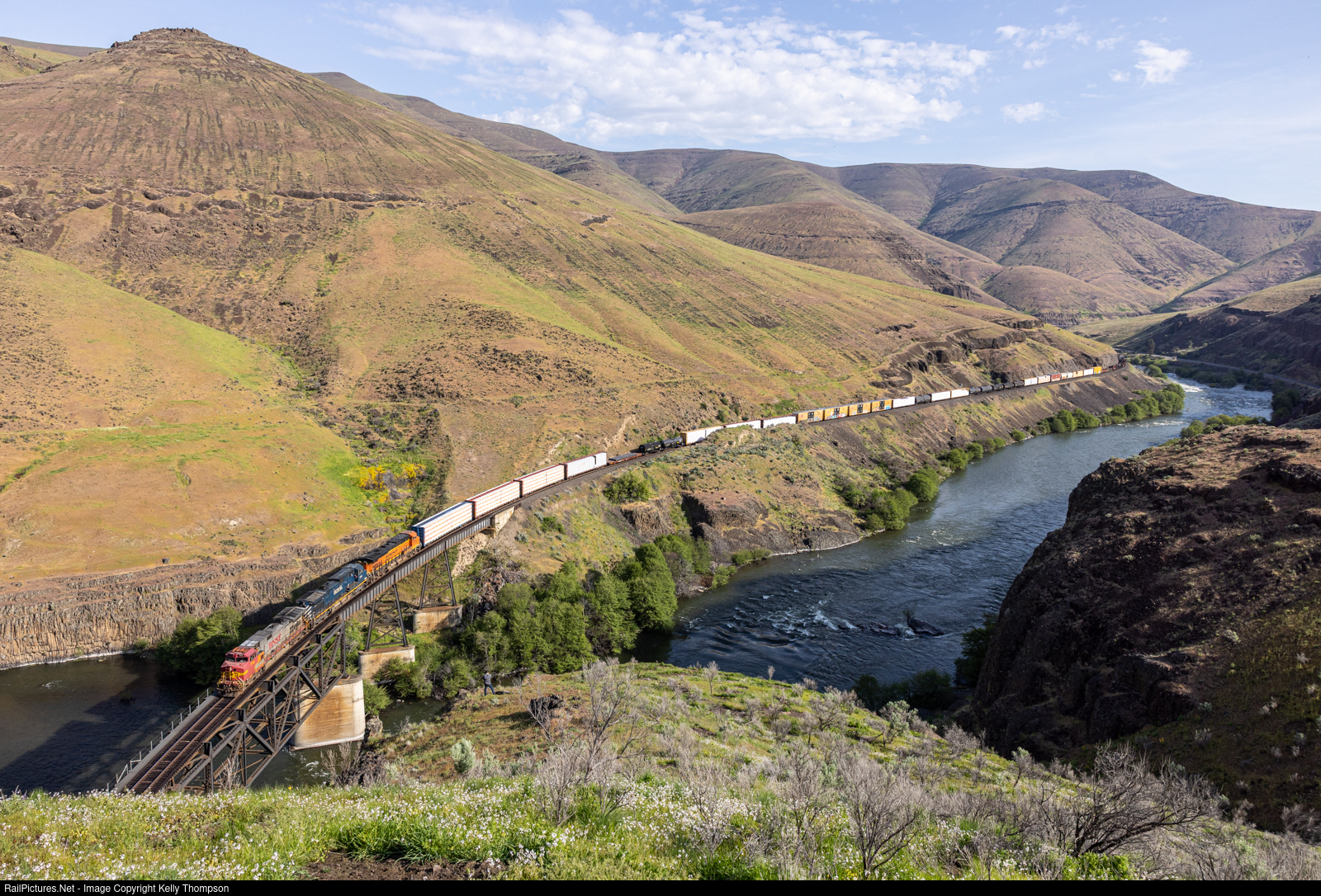 | It's a peaceful Saturday morning as a southbound manifest crosses over the Deschutes River and prepares to enter Tunnel 2 of BNSF's Oregon Trunk Sub. The rainbow lash up is led by BNSF 714, a fakebonnet, with BCOL 4651 trailing. Hard to come by a lash up like this nowadays! |