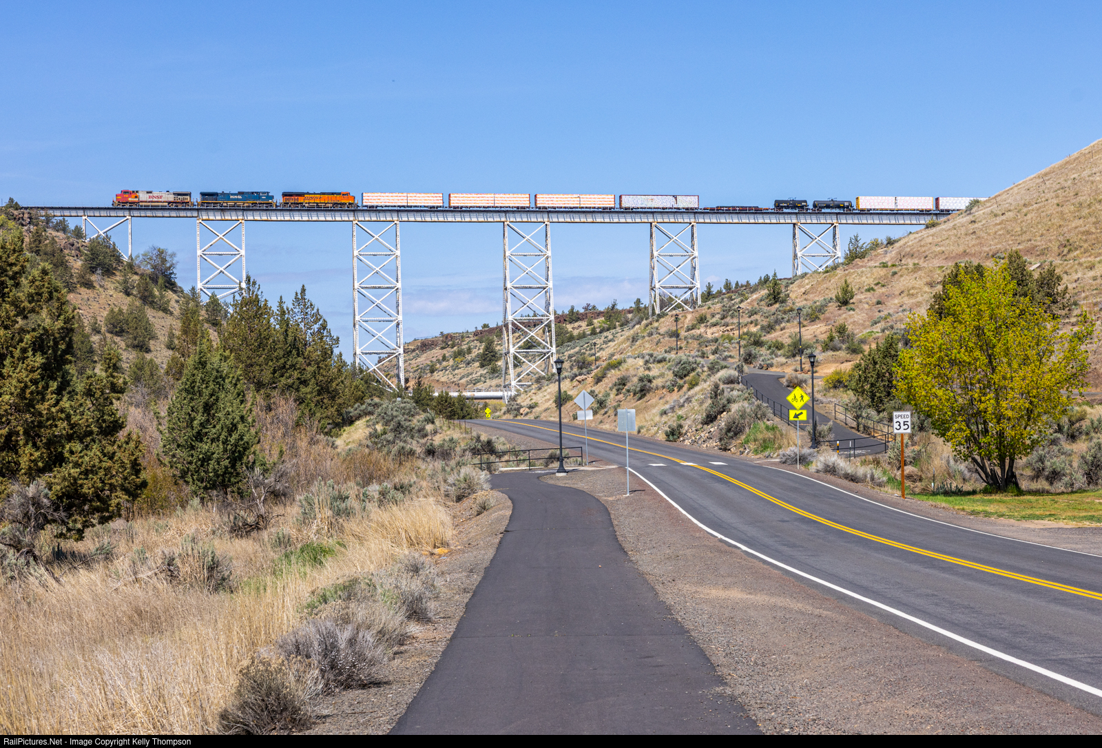 | After fighting the grade up to Gateway, BNSF 714 brings its southbound manifest into Madras as it crosses over Willow Creek Trestle. The BNSF Oregon Trunk Sub is as scenic as it gets and is littered with huge trestles. |