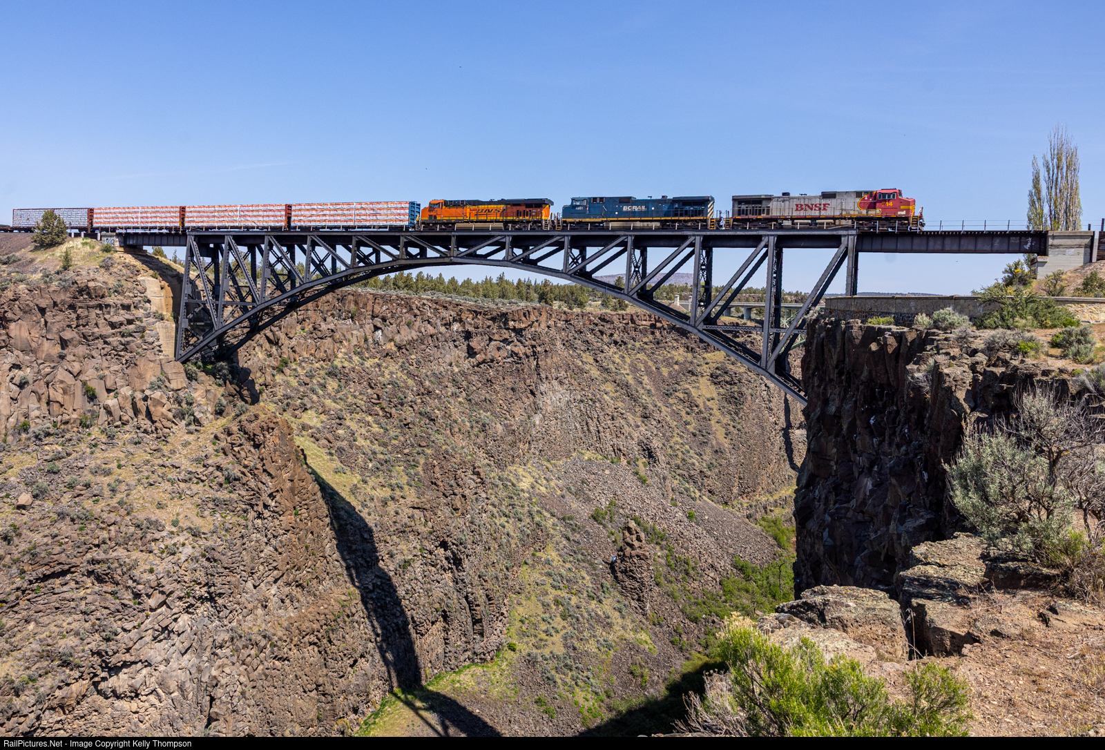 BNSF 714 is on its home stretch to Bend now as it crosses over the Crooked River birdge in Terrebonne. The birdge was completed in 1911 and is the second highest railroad bridge in the US.