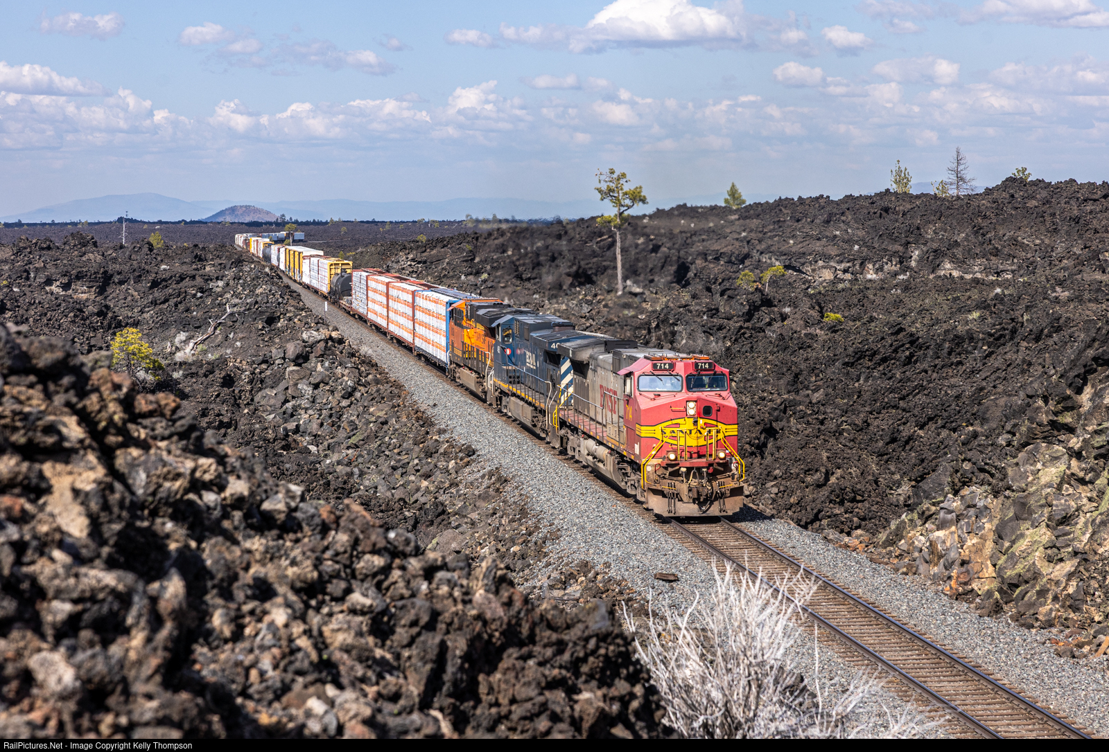After a crew change in downtown Bend, BNSF 714 heads south through the volcanic rock of Lava Butte. The volcanic rock is from Newberry Volcano which is named after John Strong Newberry, a surveyor for the Pacific Railroad in the 1800's. The last eruption from Newberry came about 1,300 years ago but is considered a very high threat level to the United States Geological Survey.